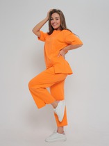 Размер 46: Свитшот: ОГ-130, ОТ-128, ширина изделия по низу-62, ширина плеча-20, длина рукава втачного с манжетой-55, ширина рукава на уровне ОП-23, ширина изделия спинки-51, длина изделия спинки-73. Брюки: ОТ в собр.-74, ОТ в раст.-104, ОБ-114, ширина изделия по низу-33, длина изделия по боковому шву с поясом-110.