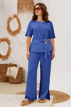 Комплект: блузка + юбка. Комплект выполнен из трикотажного полотна с люрексом. Блузка приталенного силуэта длиной до линии талии. Спереди средний шов с застежкой на потайную молнию, перекрут со сборками по боковыми швам. Спинка цельная. Рукав втачной одношовный, длиной до линии локтя. Блузка с плечевыми накладками, на подкладке. Юбка длиной макси, зауженная к низу. Переднее и заднее полотнища цельные. В левом боковом шве разрез. Юбка на цельнокроеном поясе. Юбка без подкладки.