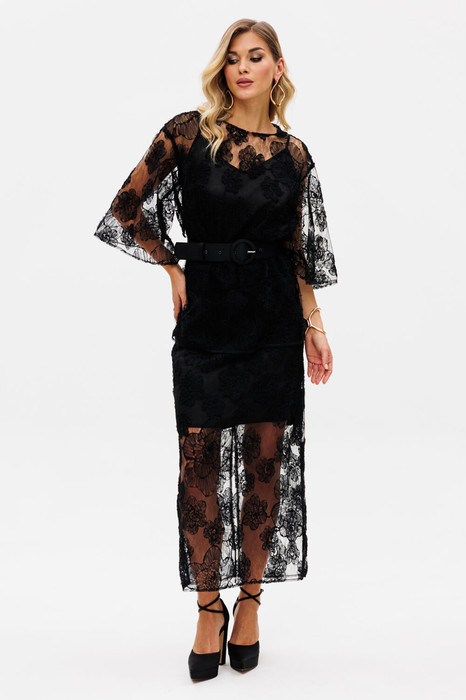 Комплект: блузка + юбка. Комплект выполнен из сетки с цветочной аппликацией. Блузка прямого силуэта, длиной до линии бедер. Перед и спинка цельные. Горловина округлой формы. Плечевой шов удлинен. Рукав рубашечного покроя, одношовный, длиной ниже линии локтя. В комплект входит съемный топ на регулируемых бретелях, из атласа. Топ прямого силуэта, длиной до линии бедер. Юбка прямого силуэта, длиной миди, на притачном поясе. Сзади в среднем шве шлица и застежка на потайную молнию. Юбка на отлетной по низу подкладке из атласа. В комплект входит съемный ремень из атласа.