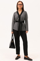 Комплект женский состоящий из блузона и брюк. Блузон прямого кроя с отрезной кокеткой по переду. Рукав приспущенный с манжетой по низу. Брюки высокой посадки с заложенными складками по линии талии и по низу. Изделие на широкой манжете по низу. По брючинам расположены накладные карманы.