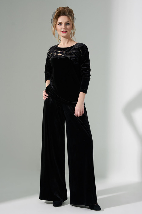 Костюм женский 2х предметный выполнен из бархатной ткани -Велюра, джемпер с приспущенным длинным рукавом. Горловина округлая, по переду расположена дизайнерская аппликация с прозрачными вставками. Брюки палаццо с высокой посадкой на притачном поясе с резинкой, по переду брюк расположены глубокие складки. Застежка - молния в боковом шве.