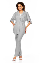 Костюм женский 2х предметный состоит из жакета и брюк. Жакет прилегающего кроя, по полочке жакета расположены прорезные карманы с клапанами. Горловина - отложной воротник с лацканами. Рукав втачной длинный.  Застежка петля-пуговица. Брюки прямого кроя с высокой посадкой, на притачном поясе со вставками эластичной тесьмы.  в боковых швах брюк -палаццо имеются карманы. Застежка  молния на гульфике, петля-пуговица. Жакет без подкладки.