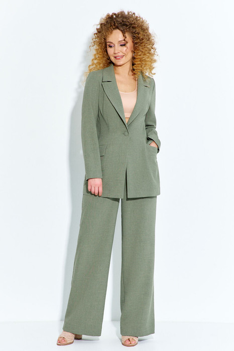 Костюм женский 2х предметный состоит из жакета и брюк. Жакет прилегающего кроя, по полочке жакета расположены прорезные карманы с клапанами. Горловина - отложной воротник с лацканами. Рукав втачной длинный. Застежка петля-пуговица. Брюки прямого кроя с высокой посадкой, на притачном поясе со вставками эластичной тесьмы. в боковых швах брюк -палаццо имеются карманы. Застежка молния на гульфике, петля-пуговица. Жакет без подкладки.