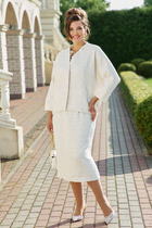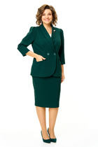 Костюм женский состоящий из жилета и брюк (брюки-юбка). Жилет выполнена из сочетания тканей: трикотажное полотно с пойетками по полочке, спинка из органзы. Горловина V-образная, п полочке горловины ассиметрично расположен декоративный волан из органзы. Спинка с декоративной вставкой из органзы, застежка потайные кнопки, Полочка жилета с подкладкой. Брюки выполнены из гладкой костюмной ткани расширенные к низу. Брюки с завышенной посадкой на притачном поясе с резинкой, в Боковых швах расположены карманы.