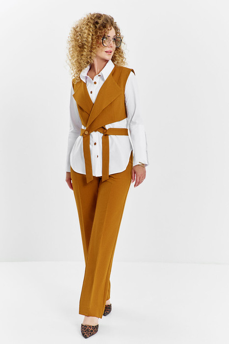 Костюм женский 3х предметный состоит тз брюк блузы и жилета, блуза выполнена из хлопковой ткани, полуприлегающего кроя , горловина воротник на стойке, рукав втачной с высокой манжетой по низу рукава, застежка - планка с петлей пуговицей, низ фигурный. Жилет свободного кроя, укороченный, воротник отложной с лацканами, по переду жилета съёмный пояс, с застежкой петли -пуговицы. Брюки средней посадки, прямого кроя на притачном поясе с резинкой, в боковых швах имеются карманы, застежка петля- пуговица и молния на гульфике.