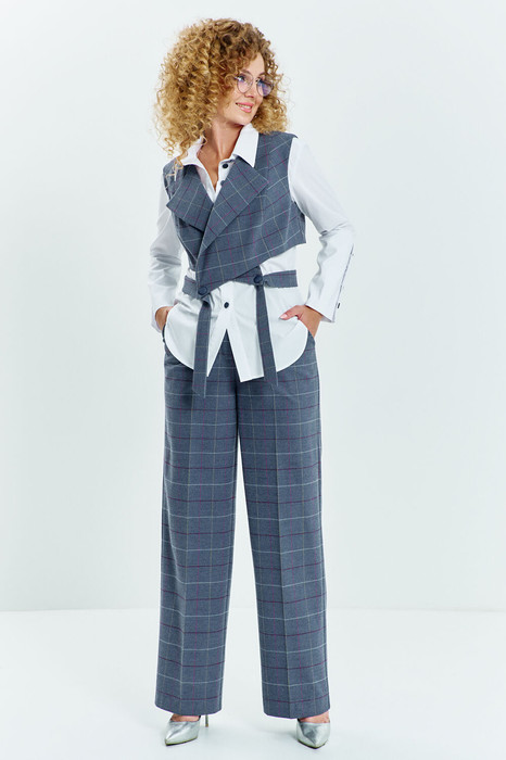 Костюм женский 3х предметный состоит тз брюк блузы и жилета, блуза выполнена из хлопковой ткани, полуприлегающего кроя , горловина воротник на стойке, рукав втачной с высокой манжетой по низу рукава, застежка - планка с петлей пуговицей, низ фигурный. Жилет свободного кроя, укороченный, воротник отложной с лацканами, по переду жилета съёмный пояс, с застежкой петли -пуговицы. Брюки средней посадки, прямого кроя на притачном поясе с резинкой, в боковых швах имеются карманы, застежка петля- пуговица и молния на гульфике
