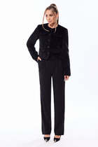 Костюм женский двухпредметный состоит из жакета и брюк. Жакет двубортный с отложным воротником и лацканами (английский воротник). По полочке жакета расположены рельефа с нагрудной выточкой и карманы. Рукав втачной длинный. Спинка жакета распашная, с фиксацией по плечам, в области талии на спинке декоративная перетяжка. Брюки прямого кроя с небольшим расклешением. брюки без пояса с обтачкой, застежка брюк молния.