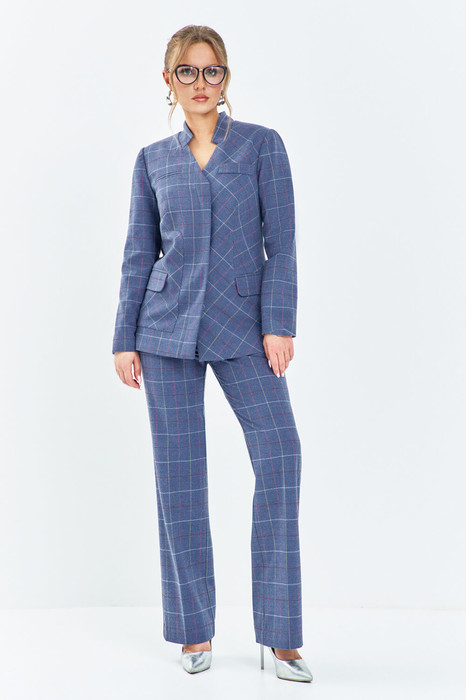Костюм женский 2хпредметный состоит из жакета и брюк, Жакет полуприлегающего силуэта выполнен из костюмной ткани, по полочке жакета расположена накладная деталь с функциональным прорезным карманом "рамка", и декоративные фальш-карманы в области груди. Рукав втачной длинный. горловина обработана плоско лежащим воротником -стойкой. Застежка жакета - потайная (супатная) на петли-пуговицы. Жакет на полной подкладке.Брюки классического кроя, прямые от бедра, с высокой посадкой. Пояс в брюках втачной с резинкой, застежка молния на гульфике и петля- пуговица.
