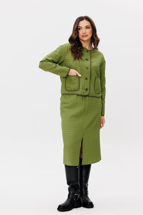 Если в одежде ты ценишь комфорт и практичность, то жакет и юбка миди из тонкого стеганого полотна – прекрасный вариант для привлекательного лука на каждый день. Ведь каждую вещь из данного комплекта можно носить независимо друг от друга. Свободный жакет упрямленного силуэта со слегка заниженной линией плеча, рукав втачной, слегка расширенный в верхней части, застежка центральная на петли и пуговицы. Полочка с накладными карманами. По краю борта, низкам рукавов, карманам и низу изделия – отделочная тесьма. Юбка А-образного силуэта, четырехклинка, на эластичном поясе с застежкой в боковом шве и эффектной шлицей спереди. Длина юбки около 70 см. Длина жакета около 52 см. Длина рукава с плечом около 73 см.