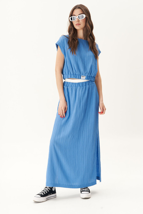 Юбка прямая, длинная с высокими разрезами в боковых швах. Пояс притачной с эластичной широкой тесьмой по спинке - для лучшей посадки на любой талии. Для удобства эксплуатации - карманы в боковых швах.