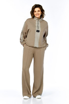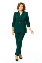 Брюки свободные, на притачном эластичном поясе в области спинки и цельнокроеном спереди. Застёжка по боковому шву на потайную молнию, петлю и пуговицу. Передние половинки брюк с отлетной деталью, оригинально драпирующейся в области талии.