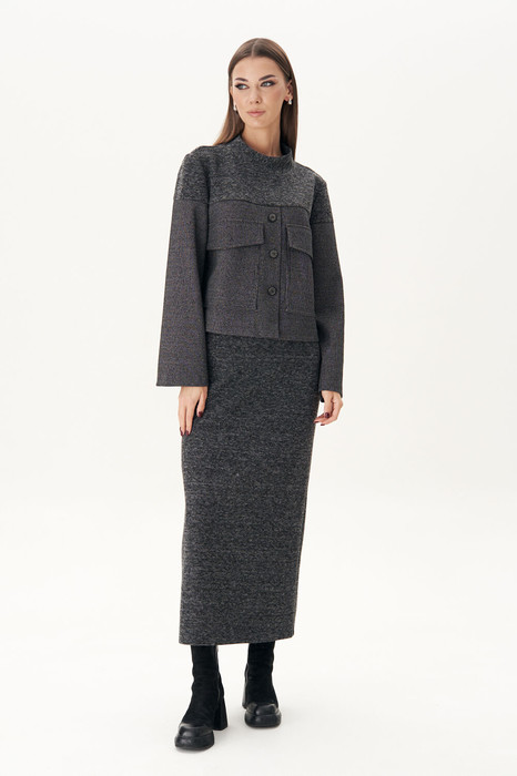 Жакет комбинированный из разных полотен. Мягкий уютный трикотаж в верхней части и комфортный текстиль в нижней. Силуэт упрямлённый, покрой втачной, воротник-стойка. Полочки с большими накладными карманами с клапаном и имитацией застёжки на пуговицы. Спинка со средним швом.