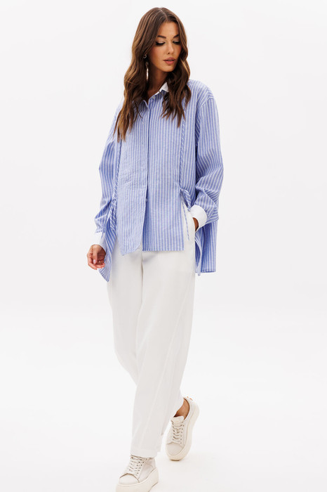 Свободный расширенный силуэт, рубашечный покрой, потайная застежка на петли и пуговицы, рубашечный рукав и воротник. Полочка с вертикальными рельефами, разрезом и отделкой под углом 45 градусов. Спинка с центральным швом с отделкой из тесьмы под углом 45 градусов.