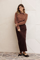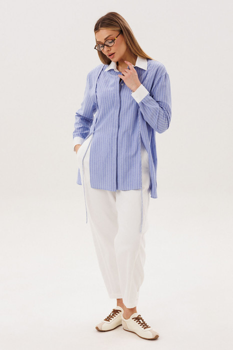 Свободный расширенный силуэт, рубашечный покрой, потайная застежка на петли и пуговицы, рубашечный рукав и воротник. Полочка с вертикальными рельефами, разрезом и отделкой под углом 45 градусов. Спинка с центральным швом с отделкой из тесьмы под углом 45 градусов.