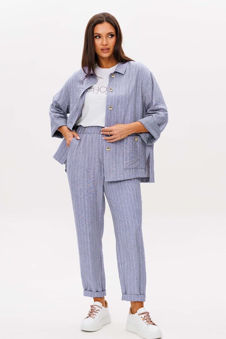 Жакет свободного упрямленного силуэта, рубашечного покроя с центральной застежкой, рубашечным рукавом и воротником, разноуровневым низом. Полочка с накладным нижним карманом. Спинка с отрезной кокеткой и легкой бантовой складкой. Рукав с отложной манжетой, по боковым швам разрезы. Длина жакета около 80 см. Длина рукава с плечом около 74 см. Длина брюк около 102 см.