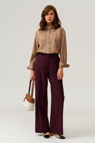 Брюки на широком приточном поясе с эластичной лентой по спинке, зауженные к линии низа. Имеют наклонные боковые карманы и имитацию кармана с листочкой на задней половинке.