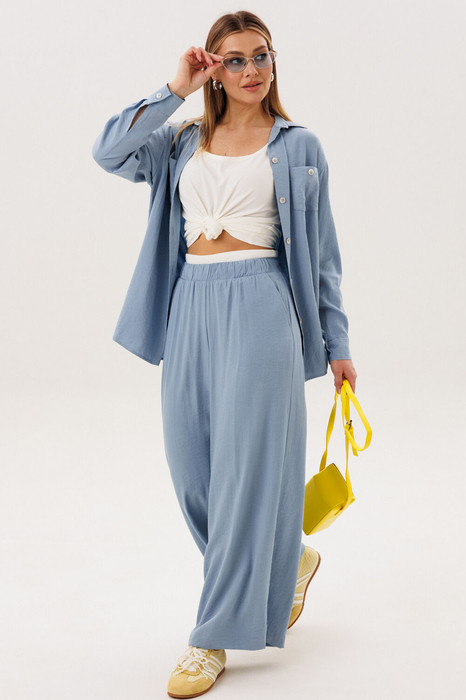 Свободная широкая рубашка и брюки-палаццо. Силуэт оверсайз, покрой рубашечный, воротник классический рубашечный с отрезной стойкой. Полочка, с отрезной кокеткой и накладными карманами. Спинка с отрезной кокеткой.