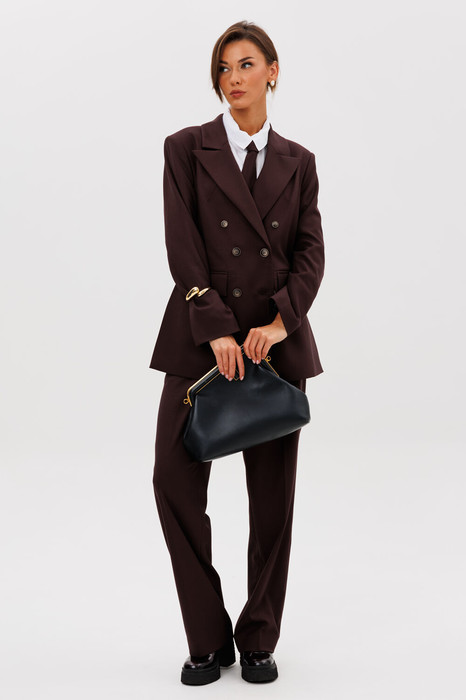 Креативные девушки наверняка по достоинству оценят модель оригинального покроя, выделяющуюся из линейки предлагаемых брючных костюмов, который выполнен в самом модном цвете осени и отлично подойдет для стрит-стайл лука, обращая на себя внимание выразительностью и интригой.