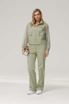Современный брючный комплект, который создаёт эффект многослойности и лёгкого сияния. Джемпер выполнен из мягкого, комфортного вискозного полотна с нейлоном и дополнен воздушными рукавами из мерцающей сетки с россыпью микропайетки. Брюки на удобном эластичном поясе имеют прозрачную нижнюю часть в тон — подвижную, блестящую и подчёркивающую силуэт. Стильное решение для тех, кто ценит тренды и оригинальное звучание образа.