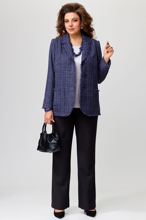 Женский комплект "Плеяна" состоит из жакета и брюк.  Жакет выполнен из твидовой ткани с блестящей нитью. Жакет на подкладке полуприлегающего силуэта, воротник отложной, по борту лацканы, низ борта закругленный, застежка однобортная на три пуговицы. По полочке - рельеф и накладной карман, по краю кармана трепка. Края воротника, лацканов и борта обработаны трепкой. По спинке - рельефы, рукав втачной двухшовный. Жакет нарядный отличный вариант для праздников и повседневной носки.Брюки прямого силуэта с застежкой на молнию и пуговицу. По переду брюк карманы, верх брюк обработан поясом, по спинке резинка. Низ обработан в подгибку.