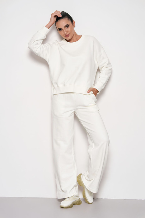 Спортивный женский костюм свободного силуэта, состоящий из худи и брюк, выполнен из высококачественного футера 3-х нитки класса "пенье". Лицевая сторона ткани гладная, изнанка - петлеобразная. Худи свободного силуэта со спущенной линией плеча, перед немного короче спинки, по бокам декоративные разрезы. Горловина, низ худи и рукавов выполнены из трикотажного полотна в рубчик (резинка) "кашкорсе" в тон основной ткани. Прямые брюки (спортивные штаны) свободного силуэта с функциональными карманами в боковых швах, пояс брюк полностью на резинке.