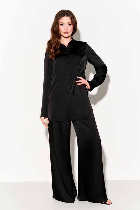 Женский костюм, состоящий из рубашки и брюк, выполнен из струящейся ткани с содержанием шёлка. Базовая женская рубашка полуприлегающего силуэта выполнена из струящейся ткани с содержанием шёлка. Рукава втачные с мягкими складками по низу рукава и высокой манжетой с одной функциональной пуговицей; по переду рельфы; воротник рубашечный; в боковых швах декоративные разрезы; застёжка по переду на петли и пуговицы. Классические брюки прямого силуэта с мягкими складками по переду и функциональными карманами в боковых швах; пояс притачной с эластичной тесьмой по спинке для лучшего прилегания; застежка на молнию, петлю и пуговицу. Костюм полностью соотвествует заявленному размеру. Пожалуйста, пользуйтесь таблицей замеров готового изделия.