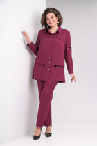 Костюм женский - жакет и брюки, изготовлен из текстильной ткани с небольшим содержанием стрейча. Жакет длиной немного ниже линии талии. Рукав длинный, рубашечного типа, линия проймы спущена. Застежка до верха на петли и пуговицы. В верхней части переда и спинки - кокетки. Нижняя часть переда и спинки оформлена вертикальными рельефами. По переду под кокетками находятся декоративные клапаны. На задней части рукава-рельеф с манжетой внизу и застежкой на петли пуговицы. Низ жакета оформлен планкой. Воротник стояче - отложной, без  стойки спереди.