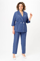 Костюм состоит из жакета и брюк из джинсовой хлопковой  ткани. Жакет полуприлегающего силуэта  с  воротником пиджачного типа.  Застежка однобортная на две пуговицы.  Перед с талиевой вытачкой, рельефом и декоративным клапаном. Спинка с рельефами из проймы и средним швом.  Рукав втачной двухшовный. Брюки расширеные книзу на притачном поясе. По поясу настрочены шлевки. По передним и задним частям брюк вытачки. На задних частях брюк настрочены карманы. Карманы, вытачки, пояс, низ брюк отделаны отделочной строчкой. Длина жакета - 68см, длина рукава жакета - 60 см, длина брюк с учетом пояса -107 см