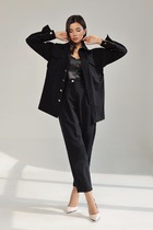 Костюм состоит из жакета и брюк из джинсовой хлопковой  ткани. Жакет полуприлегающего силуэта  с  воротником пиджачного типа.  Застежка однобортная на две пуговицы.  Перед с талиевой вытачкой, рельефом и декоративным клапаном. Спинка с рельефами из проймы и средним швом.  Рукав втачной двухшовный. Брюки расширеные книзу на притачном поясе. По поясу настрочены шлевки. По передним и задним частям брюк вытачки. На задних частях брюк настрочены карманы. Карманы, вытачки, пояс, низ брюк отделаны отделочной строчкой. Длина жакета - 68см, длина рукава жакета - 60 см, длина брюк с учетом пояса -107 см