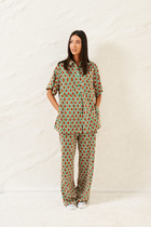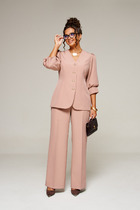 Костюм состоит из жилета и брюк, выполеных из костюмной ткани. Жилет полуприлегающего силуэта  с воротником пиджачного типа.  Перед с рельефами, талиевой вытачкой и декоративным клапаном.  Застежка центральная однобортная на 2 петли и пуговицы. Спинка со средним швом и рельефами. Вдоль оката рукава выполнена декоративная планка. К жилету прилагается тонкий пояс из основной ткани.  Брюки расширеные книзу с притачным поясом. Спереди застежка гульфик на молнии и с петлей и пуговицей по поясу. По задней частям брюк вытачки. В боковых швах карманы с наклонным входом. По поясу широкие шлевки. Брюки со срелками застроченными по переду и заутюженными сзади. Длина жилета - 71 см, длина брюк с учетом пояса - 109 см.