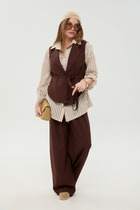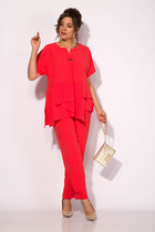 Костюм состоит из жакета и брюк из мягкой вельветовой ткани приятного цвета морского неба. Жакет полуприлегающего силуэта. Застежка однобортная на две пуговицы, воротник пиджачного типа. Перед с талиевой вытачкой, рельефом и декоративным клапаном. Спинка с рельефами из проймы и средним швом. Рукав втачной двухшовный. Жакет на подкладке. Брюки палаццо с притачным поясом . Спереди застежка гульфик на молнии и петлей и пуговицей по поясу. По задней частям брюк вытачки. Пояс с резинкой в боковых частях. Брюки с заутюженными стрелками. Длина жакета - 68 см, длина рукава жакета - 60 см. Длина брюк с учетом пояса - 109 см.