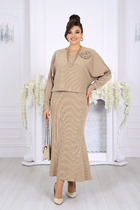 Джемпер прямого силуэта с воротником поло из плотной хлопковой ткани "двухнитка". Рукав втачной одношовный. По низу изделия, по низу рукава и по воротнику проложена отделочная строчка. Брюки палаццо с притачным поясом из мягкой вельветовой ткани. Спереди застежка гульфик на молнии и петлей и пуговицей по поясу. По задней частям брюк вытачки. Пояс с резинкой в боковых частях. Брюки с заутюженными стрелками. Длина джемпера- 66 см, длина рукава - 60 см. Длина брюк с учетом пояса - 109 см.