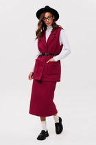 Костюм состоит из блузки и брюк. Блузка оригинальная приталенного силуэта из вельветовой ткани. Перед с подрезом под грудью, сборкой в районе груди и талиевыми вытачками. Затсежка на петли и пуговицы. Горловина V-образной формы. Спинка с талиевыми вытачками. Рукав втачной со сборкой по окату и с манжетой по низу. Манжета высокая с двумя петлями и пуговицами. Длина блузки - 63 см, длина рукава блузки - 64 см. Брюки палаццо с притачным поясом из мягкой вельветовой ткани. Спереди застежка гульфик на молнии и петлей и пуговицей по поясу. По задней частям брюк вытачки. Пояс с резинкой в боковых частях. Брюки с заутюженными стрелками. Длина брюк с учетом пояса - 109 см.