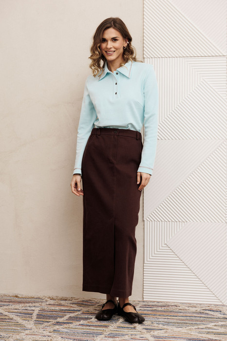 Костюм состоит из джемпера и юбки. Джемпер слегка приталенного силуэта с воротником поло из трикотажного полотна. Рукав втачной одношовный. Длина джемпера - 57 см, длина рукава - 60 см. Юбка прямого силуэта выполненная из джинсовой ткани. Передняя честь юбки с вытачками, со средним швом и застежкой гульфиком на молнии и щлицей спереди. Задняя часть юбки с вытачками. Юбка на притачном поясе с затежкой на петлю и пуговицу спереди и резинками по бокам. Длина юбки с учетом пояса - 90 см.