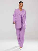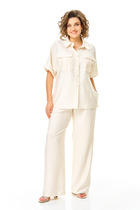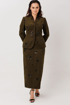 Костюм состоит из джемпера и юбки. Джемпер приталеного силуэта с воротником поло из трикотажного полотна. Рукав втачной одношовный. Длина джемпера - 57 см, длина рукава - 60 см. Юбка прямого силуэта выполненная из мягкой вельветовой ткани. Передняя честь юбки с вытачками, со средним швом и застежкой гульфиком на молнии и щлицей спереди. Задняя часть юбки с вытачками. Юбка на притачном поясе с затежкой на петлю и пуговицу спереди и резинками по бокам. Юбка на подкладке. Длина юбки с учетом пояса - 90 см.