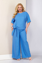 Костюм состоит из джемпера и юбки. Джемпер приталеного силуэта с воротником поло из  трикотажного полотна. Рукав втачной одношовный.  Длина джемпера - 57 см, длина рукава - 60 см. Юбка прямого силуэта выполненная из мягкой вельветовой ткани. Передняя честь юбки с вытачками, со средним швом и застежкой гульфиком на молнии и щлицей спереди. Задняя часть юбки с вытачками. Юбка на притачном поясе с затежкой на петлю и пуговицу спереди и резинками по бокам. Юбка на подкладке. Длина юбки с учетом пояса - 90 см.