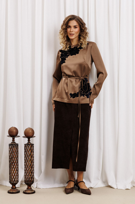 Костюм состоит из блузки и юбки. Блузка прямого силуэта выполнена из атласной ткани. Перед с нагрудной вытачкой. Спинка со средним швом и застежкой "капелькой" на петлю и пуговицу сверху. Рукав втачной одношовный. В боковых швах разрезы. По переду настрочена аппликация из велюровых цветов на сетке. К блузке прилагается пояс из основной ткани. Длина блузки - 63 см, длина рукава - 61 см. Юбка прямого силуэта выполненная из мягкой вельветовой ткани. Передняя честь юбки с вытачками, со средним швом и застежкой гульфиком на молнии и щлицей спереди. Задняя часть юбки с вытачками. Юбка на притачном поясе с затежкой на петлю и пуговицу спереди и резинками по бокам. Юбка на подкладке. Длина юбки с учетом пояса - 90 см.