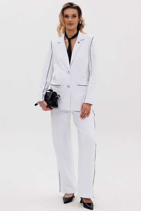 Костюм в стиле smart casual с контрастными кантами в швах создаст в меру строгий и одновременно расслабленный образ как для работы, так и торжественного мероприятия.