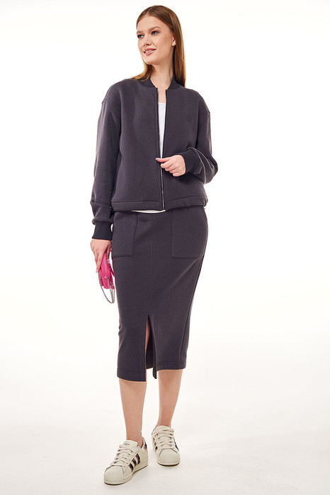 Современный комфортный костюм, состоит из зауженной юбки и укороченного бомбера. Отлично подойдёт для офиса, прогулок и путешествий. Пошит из теплой, комфортной ткани. Бомбер прямого силуэта, с застежкой молнией из металла. Горловина, манжеты рукавов выполнены из ткани-компаньона кошкорсе. На левом переде вышивка-логотип в цвет ткани. Бомбер с кулисой по низу с резинкой внутри и фиксаторами на боковых швах. Юбка зауженная к низу, облегающая фигуру, длиной миди. Перед с удобными боковыми карманами, по центру переда разрез с отделочной строчкой. Пояс из ткани кошкорсе, с резинкой внутри.