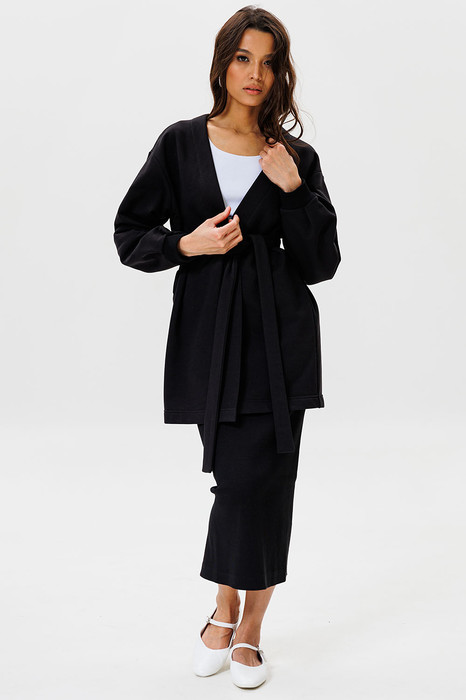 Костюм Gowear из футера в стиле smart casual поможет создать в меру строгий и одновременно расслабленный образ. Костюм состоит из жакета и юбки из эластичной ткани кошкорсе. Жакет прямого силуэт, с v-образным вырезом горловины, без застежки, с отдельным поясом. На левом переде вышивка-логотип в цвет ткани. Рукав свободный, со складками, присобран на манжету. Жакет без подкладки. Юбка прямая, облегающая фигуру с разрезом на спинке. Пояс цельнокроенный с резинкой внутри.