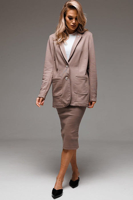 Костюм Gowear из футера в стиле smart casual поможет создать в меру строгий и одновременно расслабленный образ. Костюм состоит из жакета и юбки из эластичной ткани кошкорсе. Жакет прямого силуэта с воротником и лацканами, имеет удобные карманы и застежку на 2 пуговицы. На левом лацкане вышивка-логотип в контрастном цвете. Низ и борта имеют открытые края (эффект необработанного шва), укреплены дополнительной строчкой. Жакет без подкладки. Юбка прямая, облегающая фигуру с разрезом на спинке. Пояс цельнокроенный с резинкой внутри.