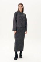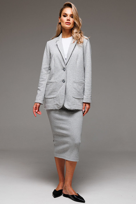 Костюм Gowear из футера в стиле smart casual поможет создать в меру строгий и одновременно расслабленный образ. Костюм состоит из жакета и юбки из эластичной ткани кошкорсе. Жакет прямого силуэта с воротником и лацканами, имеет удобные карманы и застежку на 2 пуговицы. На левом лацкане вышивка-логотип в контрастном цвете. Низ и борта имеют открытые края (эффект необработанного шва), укреплены дополнительной строчкой. Жакет без подкладки. Юбка прямая, облегающая фигуру с разрезом на спинке. Пояс цельнокроенный с резинкой внутри.