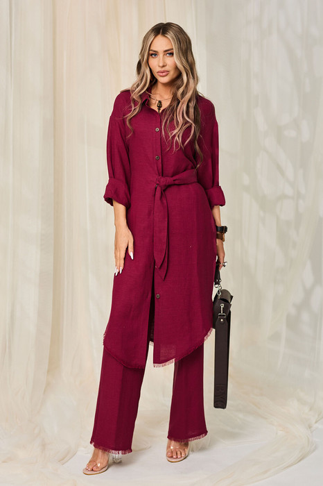 Туника с центральной застежкой на петли и пуговицы, втачным воротником с отрезной стойкой. Плечо спущенное, рукав втачной, длинный, с отрезной манжетой. Спинка с отрезной кокеткой, по шву притачивания кокетки- бантовая складка. На боковых швах расположены шлевки для декоративного пояса. Пояс может фиксироваться в петле по борту правой полочки. Низ туники фигурный, с притачной деталью- бахромой. Брюки с отрезным поясом. Передние половинки с карманами, вход в карман наклонный к боковому шву. Пояс присборен на резинку. По низу брюк притачная деталь с бахромой.