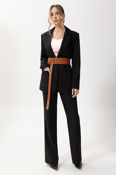 Жакет с центральной застежкой на петли и пуговицы, втачным воротником и отложным лацканом пиджачного типа. По переду нагрудные вытачки и накладные карманы. Спинка со средним швом. Брюки- с отрезным поясом, на поясе расположены шлевки. По спинке пояс присборен на резинку. По боковым швам расположены карманы. Вход в карман наклонный к боковому шву. По передним половинкам, по шву притачивания пояса- односторонние складки. Застежка гульфик. Комплект со съемным поясом.