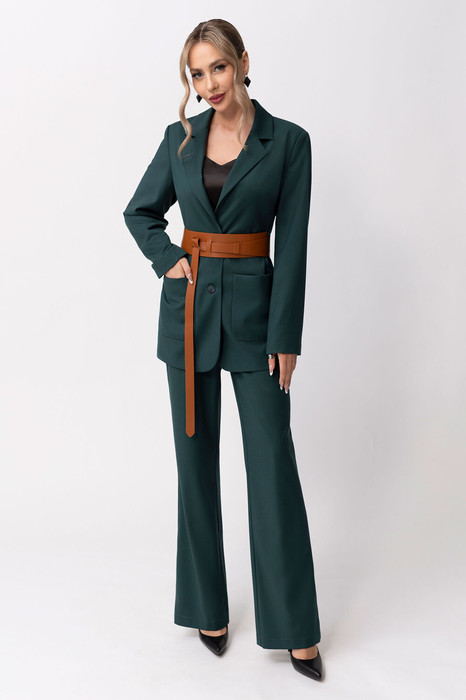 Жакет с центральной застежкой на петли и пуговицы, втачным воротником и отложным лацканом пиджачного типа. По переду нагрудные вытачки и накладные карманы. Спинка со средним швом. Брюки- с отрезным поясом, на поясе расположены шлевки. По спинке пояс присборен на резинку. По боковым швам расположены карманы.  Вход в карман наклонный к боковому шву. По передним половинкам, по шву притачивания пояса- односторонние складки. Застежка гульфик. Комплект со съемным поясом.