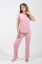 Блузка с центральной застежкой на петли и пуговицы, втачным воротником с отрезной стойкой. По переду нагрудные вытачки . Спинка цельная. Рукав втачной, короткий, с отрезной манжетой. Брюки- с цельнокроенным поясом. Пояс присборен на резинку, с кулисой и шнуром- завязкой. В боковых швах расположены карманы. Ниже линии бедер расположены накладные карманы с клапанами.
