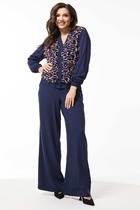 Жакет с центральной застежкой на петли и пуговицы, отложным воротником и лацканами пиджачного типа. По переду с рельефами, выходящими из проймы и из плеча. Спинка со средним швом, рельефами, выходящими из проймы. Рукав втачной, длинный. Брюки без пояса, верхний срез обработан обтачками, в области спинки брюки присборены на резинку. В боковых швах расположены карманы. Вход в карман наклонный к боковому шву. Застежка гульфик.