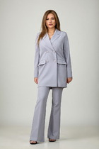 Блузон с центральной застежкой на петли и пуговицы, втачным воротником с отрезной стойкой. По переду с нагрудными вытачками, спинка цельная, по боковым швам- разрезы. Рукав втачной, длинный, с отрезной манжетой. Топ без воротника, с V-образным вырезом горловины. По переду с нагрудными вытачками. Брюки прямые, с отрезным поясом. Пояс присборен на резинку. Передние половинки с карманами. Вход в карман наклонный к боковому шву.