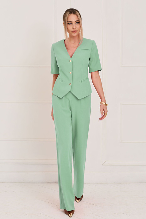 Жакет с центральной застежкой на петли и пуговицы, без воротника, с V-образным вырезом горловины. По переду с талиевыми вытачками и рельефами, выходящими из проймы, прорезными карманами в рамку, расположенными на уровне линии талии. Спинка со средним швом, рельефами, выходящими из проймы. Рукав втачной, короткий. Брюки с отрезным поясом, на поясе по переду расположены декоративные пояски с пряжками. Пояс в области спинки присборен на резинку. Застежка гульфик. По боковым швам расположены карманы. Вход в карман наклонный к боковому шву.