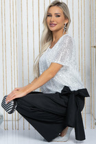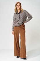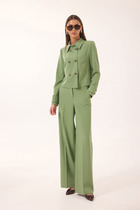 Жакет с центральной двубортной застежкой на пришивные кнопки, без воротника с отложными лацканами. По переду с рельефами, выходящими из проймы, талиевыми вытачками. Спинка со средним швом, рельефами, выходящими из проймы, талиевыми вытачками. Рукав втачной, длинный. Брюки с отрезным поясом, на поясе расположены шлевки. В боковых швах расположены карманы. Вход в карман наклонный к боковому шву. Застежка гульфик. Пояс в области спинки присборен на резинку. Костюм со съемным декоративным поясом. Декоративный пояс из кожзама, декорирован бахромой.